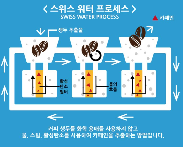 두 번째는 물과 활성탄을 이용한 방법입니다. 스위스 워터 프로세스(SWp)와 마운틴 워터 프로세스(MWp)가 있습니다. 안전해서 요즘 가장 선호하는 방식이지만 원두의 향이 일부 손실되는 단점이 있습니다.