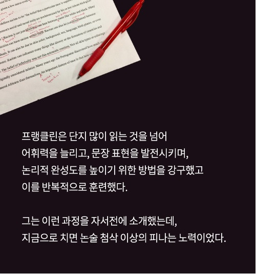 글쓰기 능력이 실생활에서 제법 중요한 역할을 합니다. 여기서 유의할 점은 단순히 '글을 잘 쓴다'가 아니라 생각을 정리하는 힘이 있다는 부분입니다. 글을 잘 쓴다는 건 말도 잘하고 아이디어도 잘 내며 대화도 논리적으로 한다는 뜻이니까요.