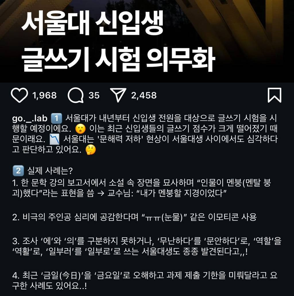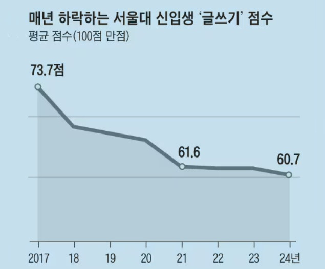 이런 이유로 올해부터 서울대가 신입생 전원을 대상으로 글쓰기 시험을 시행한다고 밝혔습니다. 그동안 신입생 중에서 희망자에 한해서만 이 시험을 시행해 왔는데 최근 신입생들의 점수가 해가 갈수록 낮아지자 이같이 결정했다고 합니다. 일부에만 국한되었다고 여겨진 ‘문해력 저하’ 현상이 우리나라에서 가장 우수한 학생들이 모인 서울대에서도 우려할 수준이라고 판단해서였죠.