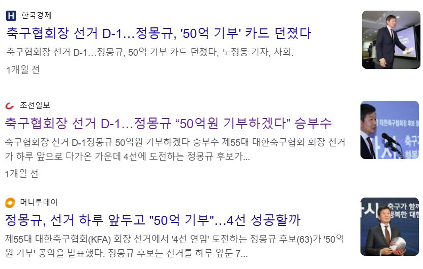 그동안 이 선거는 진흙탕 싸움이라고 해도 과언이 아니었습니다. 정몽규 후보의 50억 기부 발언을 비롯해 문체부까지 참전해서 회장단에 대한 징계를 요청하고 경선까지 중단되는 사태가 발생하는 등 난리가 나면서 원래 계획했던 일정보다 많이 미뤄져 어제 치러졌죠.