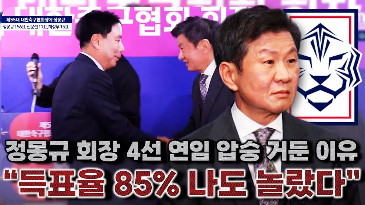 2월 26일 서울 신문로 축구회관에서 열린 제55대 대한축구협회 회장 선거는 총 투표수(선거인단 192명, 투표 183명, 무효 1표) 183표 중에서 156표(85.2%)를 얻은 정몽규 후보가 결국 4선에 성공했습니다. 어 득표율 85.2%의 압도적인 지지로 당선되었습니다. 많은 국민들의 염원은 끝내 이뤄지지 않았습니다.