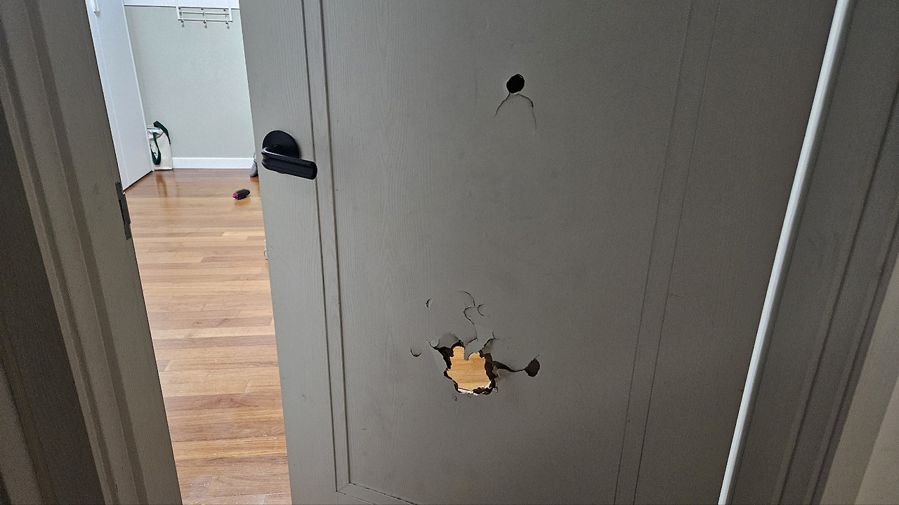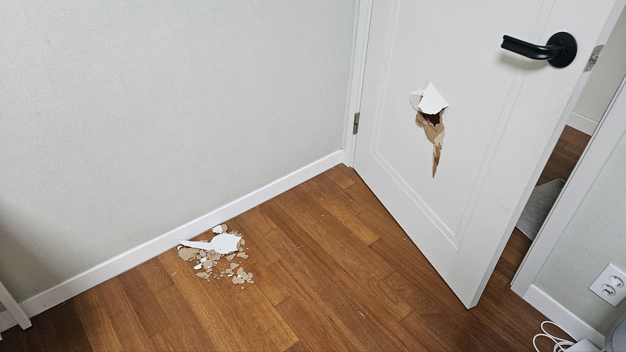 바로 아이들 방에 달린 문이 처참하게 구멍이 난 상태로 저를 힘없이 맞아주고 있어서였죠.