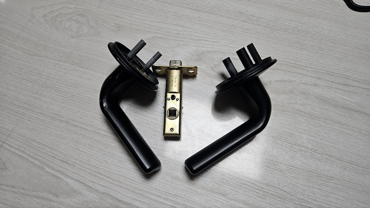 저녁을 먹은 뒤에 부서진 문고리를 분리했습니다. 덕분에 방문 손잡이가 어떤 메커니즘으로 움직이는지 잠시나마 배울 수 있었죠.