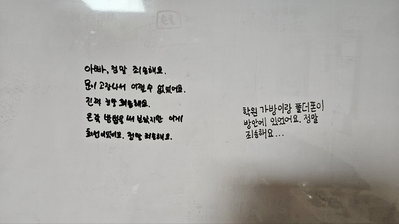 문이 왜 이렇게 되었는지 이실직고한 장문의 편지가 거실 화이트보드에 적혀 있었기 때문이었죠.