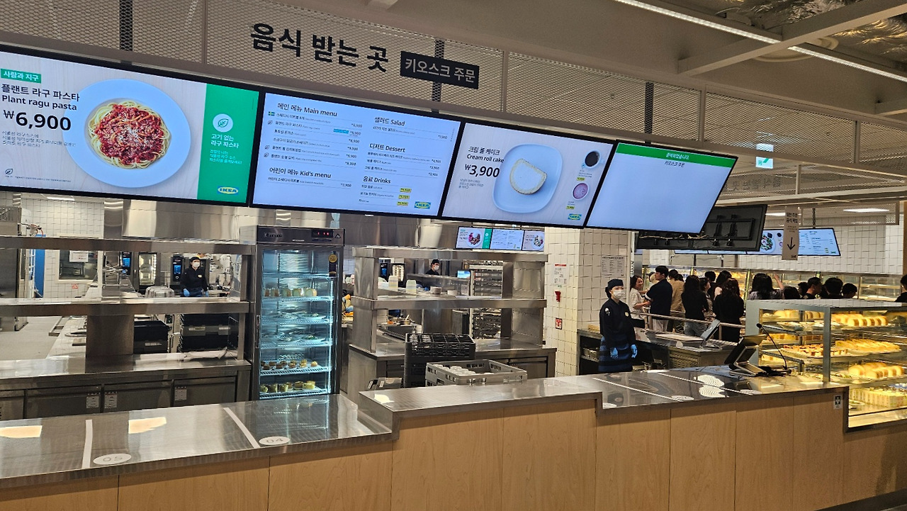 이제 끝인가 싶은 마음이 들 때쯤 식당에 도착합니다. 대략 눈대중으로만 봐도 300석 규모는 족히 돼 보이는 수준입니다. 식사는 여기서 해결하기로 합니다. 메뉴는 스웨디시 미트볼, 파스타, 연어 요리, 채식 메뉴, 파이까지 꽤 골고루 준비돼 있었고, 값은 무난하며 맛은 좋은 편이었습니다. 직접 주문을 할 수도 있는데 보통은 키오스크를 이용합니다.