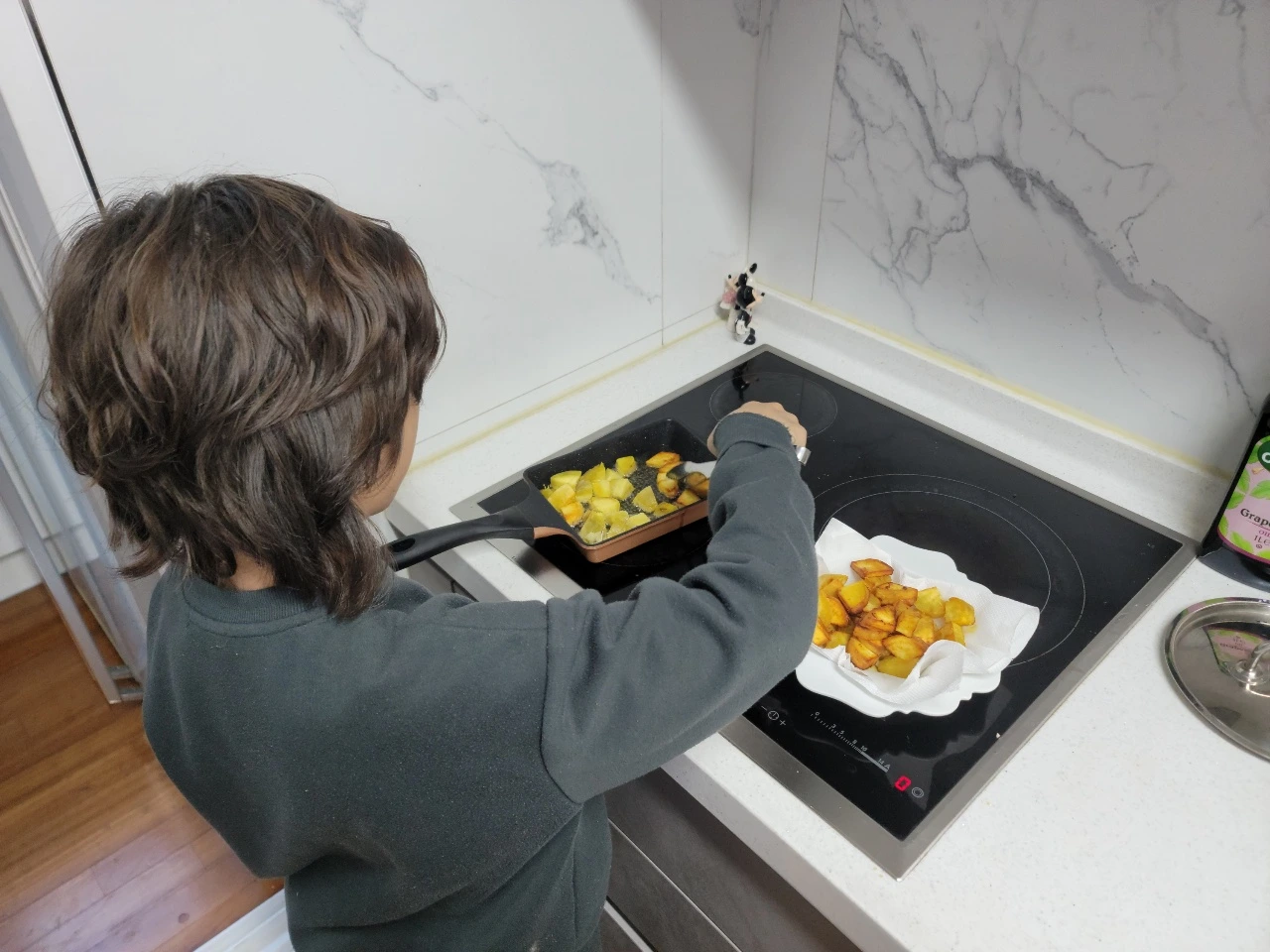 아이도 함께 옆에서 도와준 덕분에(?) 시간은 더 걸렸지만 그래서 더 의미 있는 신메뉴인 고구마 맛탕을 온전하게 만들어냈습니다. 다 함께 게눈 감추듯 먹어치우는 모습을 보니 보람도 있고 뿌듯하긴 합니다.