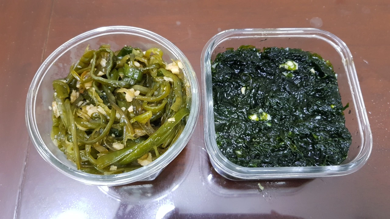 미역줄기볶음, 파래무침(좌), 메추리알 조림(우)