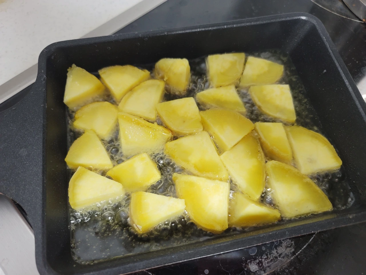 제가 평소에 만들었던 맛탕은 생고구마의 전분기를 물에 담가서 빼고 바로 튀기는 방식이었습니다. 이 맛탕은 달랐습니다. 고구마를 어느 정도 삶은 뒤 튀기는 식이어서 시간과 노력은 두 배로 들었습니다.
