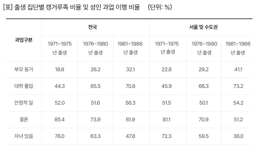 서울연구원에서 나온 보고서를 보면 흥미로운 통계가 등장합니다. 35세가 되었을 때 부모와 함께 사는 비율이 1971~1975년생은 18.6%, 1981~1986년생은 32.1%에 이른다고 합니다. 서울과 수도권 거주자로만 좁혀 보면 1981~1986년생은 무려 41.1%가 부모와 함께 살고 있다는 결과도 있었습니다. 무려 10년 사이에 두 배 이상 늘어난 셈입니다.