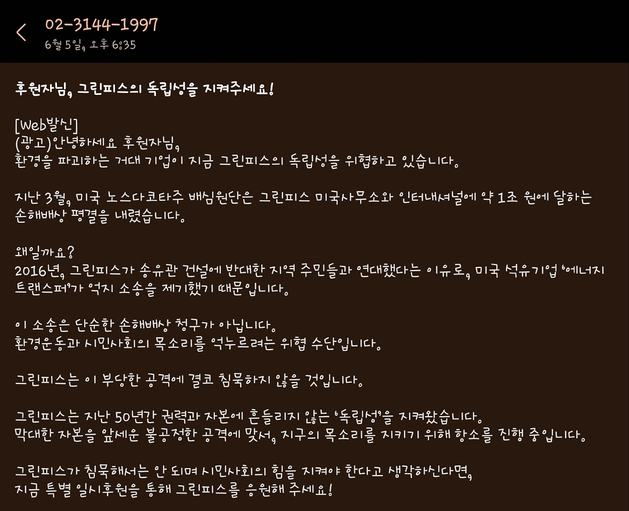 며칠 전, 정말 놀라운 문자를 받았습니다. 바로 제가 후원하고 있는 환경단체 그린피스로부터 였는데요, 그 내용을 읽고 잠시 멍해졌습니다. 미국의 대형 송유관 기업이 그린피스를 상대로 거액의 손해배상 소송을 제기했고, 법원은 그린피스에게 약 9,700억 원에 달하는 배상 책임을 인정했다는 내용이었습니다.