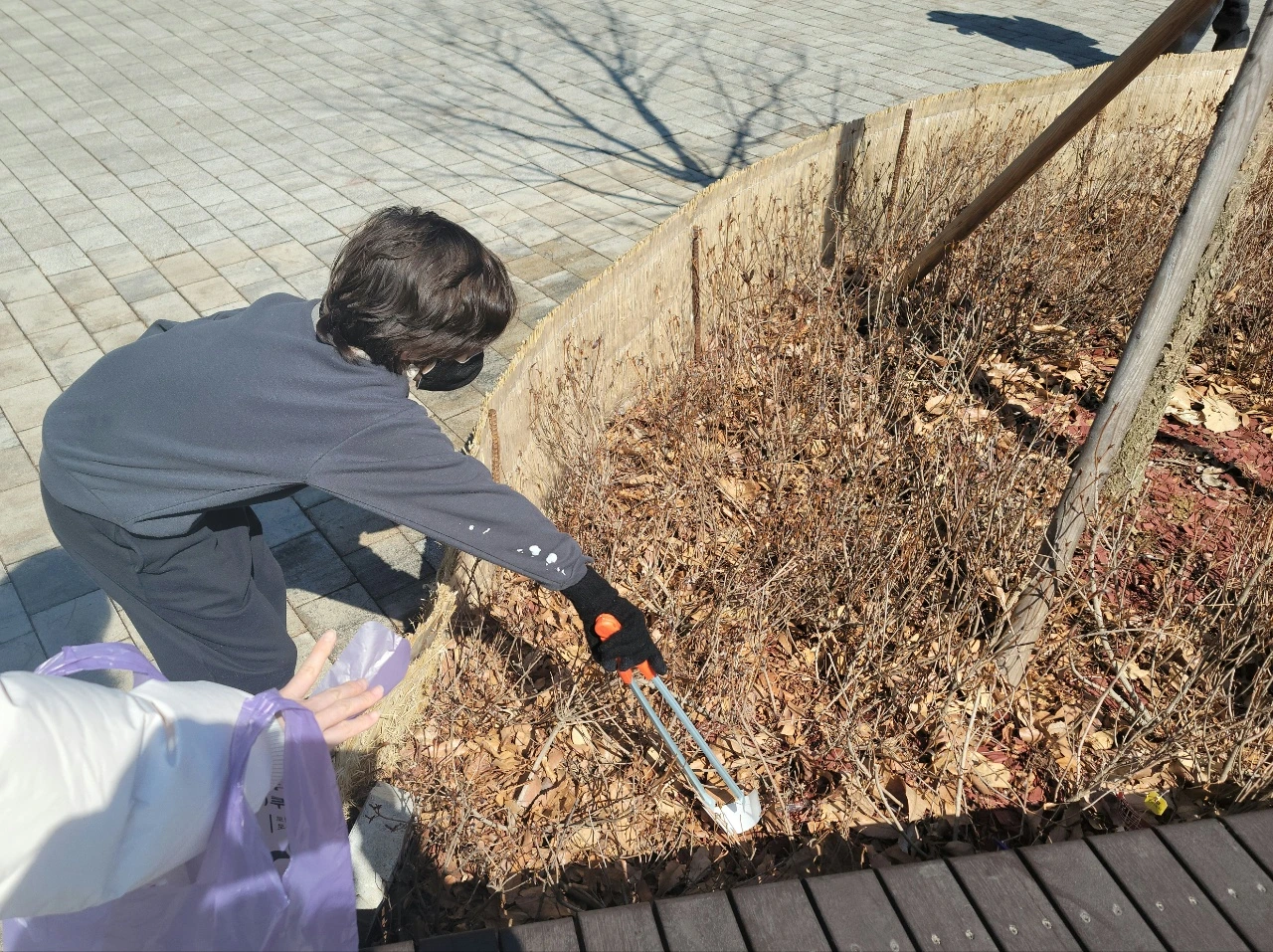 예전 학창 시절에 단체로 쓰레기 줍기나 바닥에 붙은 껌을 떼는 활동을 하고 회사에서 주변 환경미화 활동을 한 이후로는 참 오랜만에 잡아보는 쓰레기봉투입니다. 두 개의 집게는 아이들이 들고 저는 아이들의 쓰레기를 받아주는 것으로 역할이 완벽히 분담되었습니다. 물론 시쳇말로 '찍사'도 있어야겠죠? 사진사의 임무는 엄마에게 주어졌습니다.