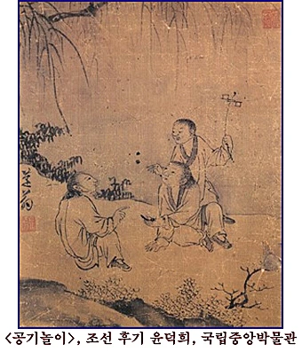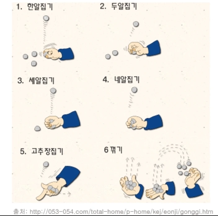 결국 우격다짐에 가깝게 껴서 세 명이 돌아가며 게임을 시작했습니다. 일단 꺾기(참고자료 참조)로 열 번의 공기를 손에 쥐는 사람이 이기는, 즉 10년을 채우는 사람이 이기는 것으로 정했습니다. 제가 아무리 손이 녹슬었다 하더라도 예전의 가락은 남아있었나 봅니다. 몇 번 해보다 보니 손도 풀리기 시작했습니다.