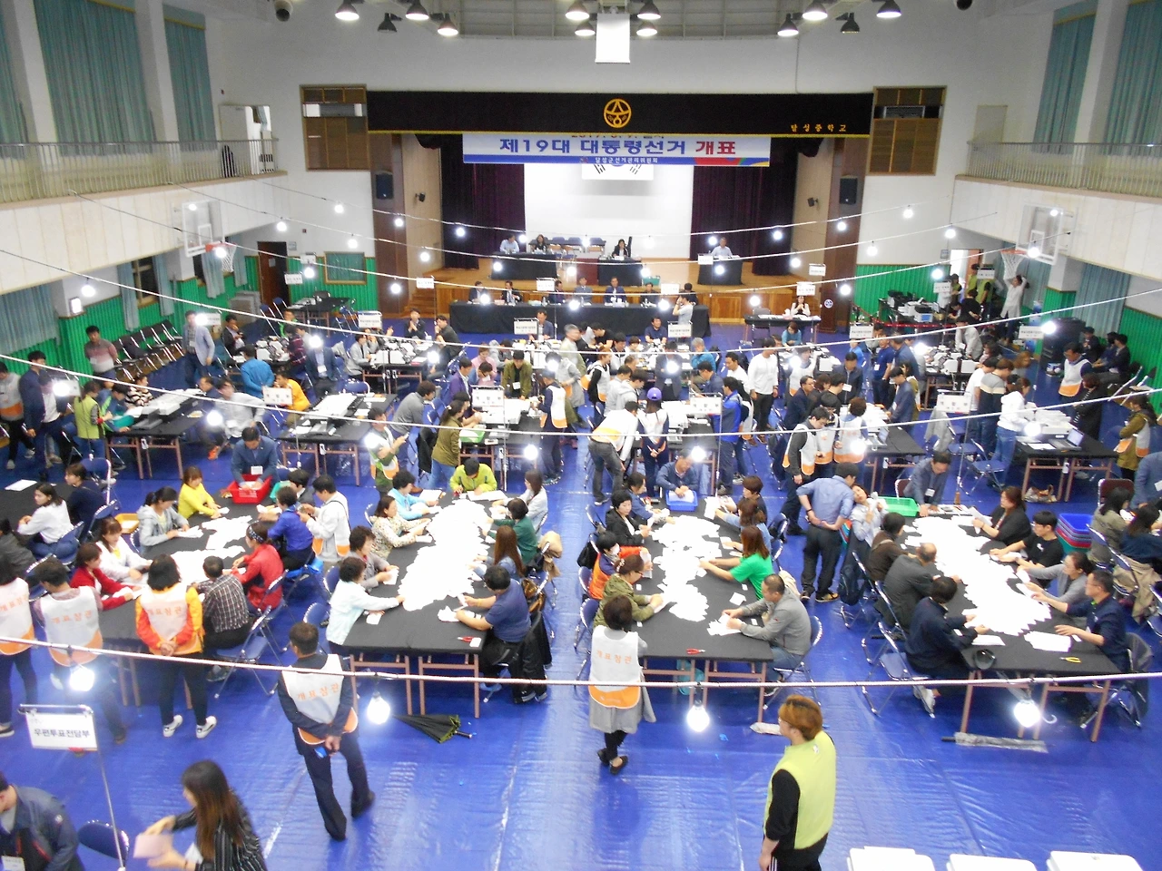 7시 반의 법정 투표시간이 끝나고 나서 몇 분 지나지 않아 본격적으로 개표행사가 진행되었습니다. 강당 안에는 강동구에 사는 30여만 명의 주민들이 행사한 참정권을 확인하기 위해 삼백여 명에 가까운 개표사무원 분들이 책상에 앉아서 대기 중이었습니다.