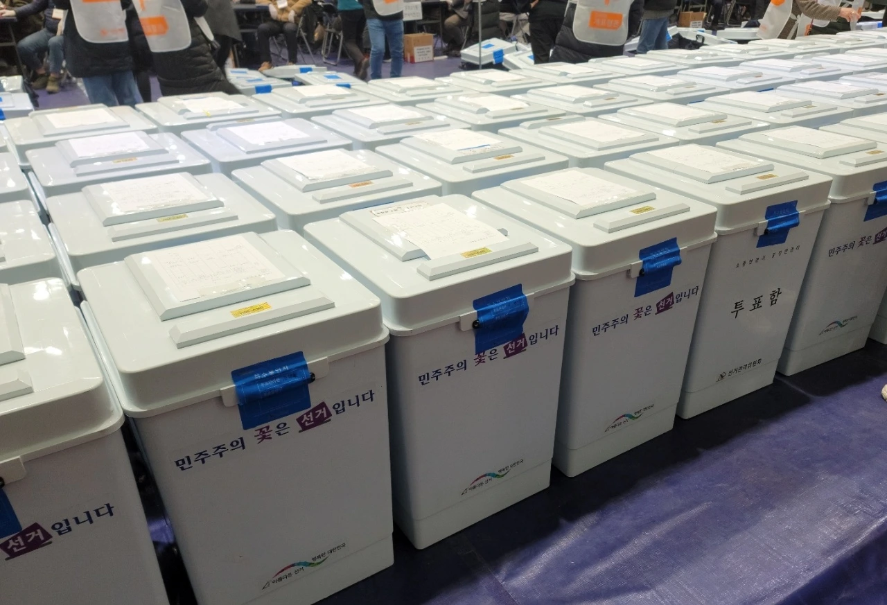 사전 설명이 끝나고 나니 본격적으로 개표가 진행됩니다. 각 투표소에서 순서대로 도착한 투표함들은 강당 뒤쪽에 차곡차곡 쌓이기 시작합니다. 속속들이 도착하기 시작한 투표함들이 모두 도착하면 본격적으로 시작됩니다. 정해진 지역별 책상에서 투표용지가 쏟아지면 본격적인 개표는 시작됩니다.
