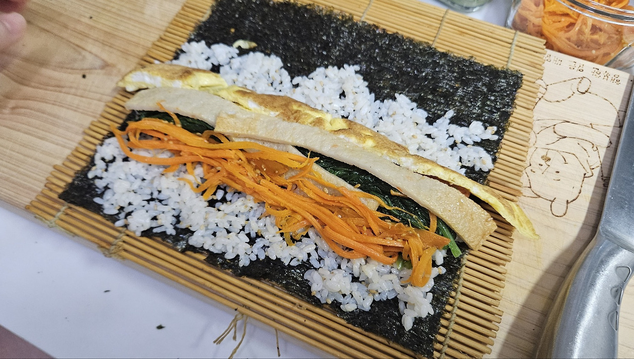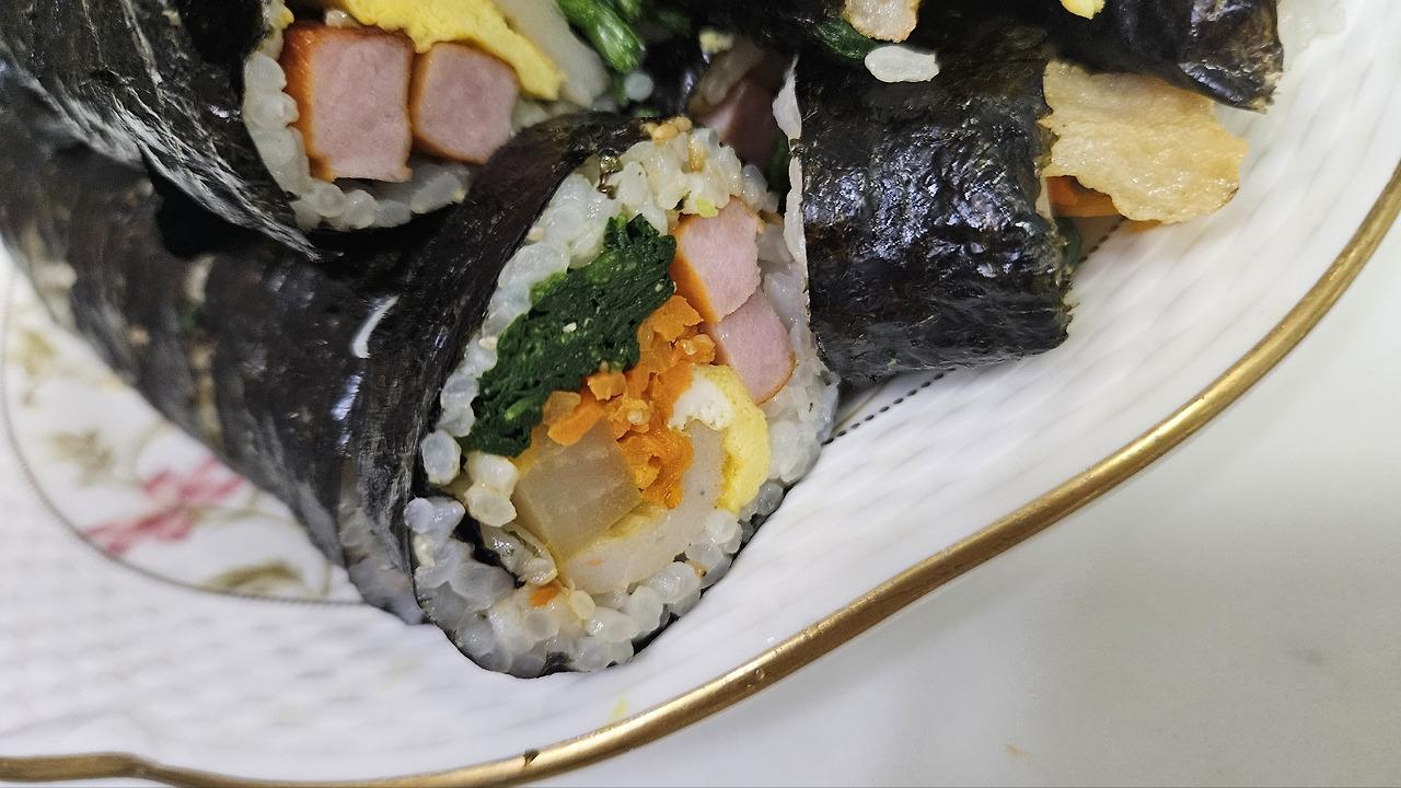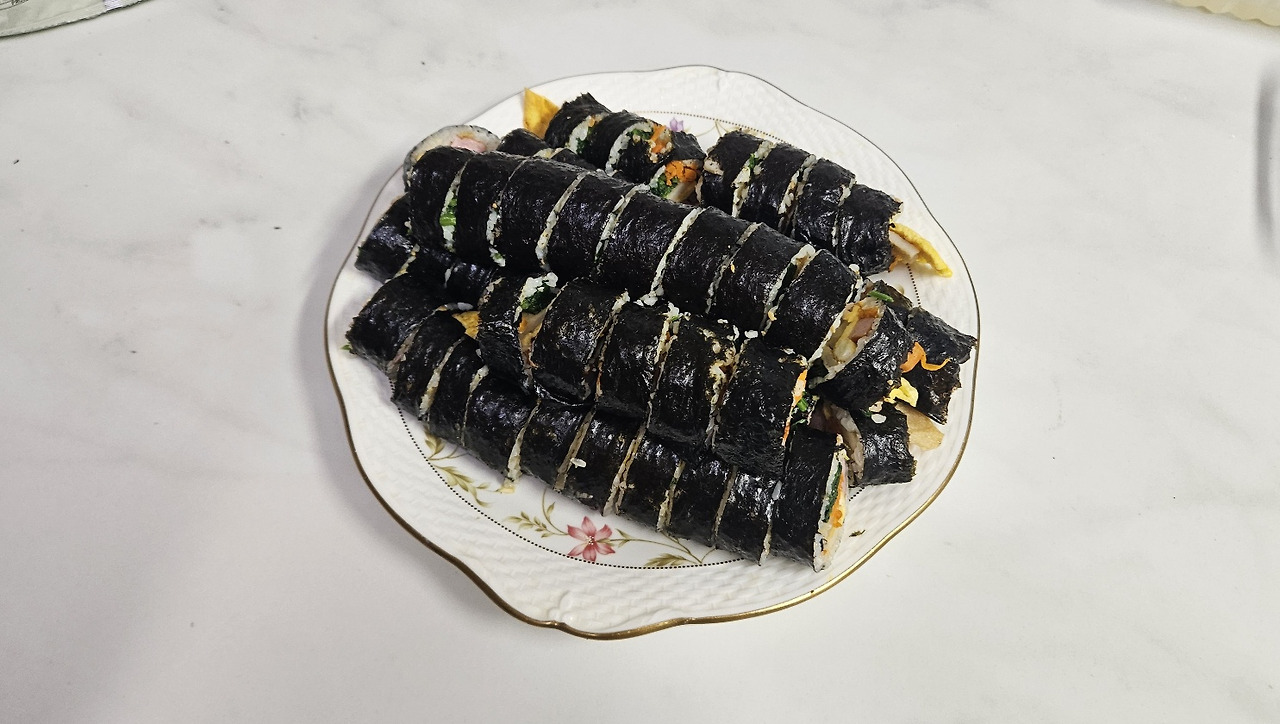 잡채는 부추로 대체 가능한데 김밥에서 시금치는 대체 불가능입니다. 그렇게 김밥 김 한 봉지에 있는 모든 김과 모든 재료들을 사용해서 한 끼의 김밥을 완성합니다.