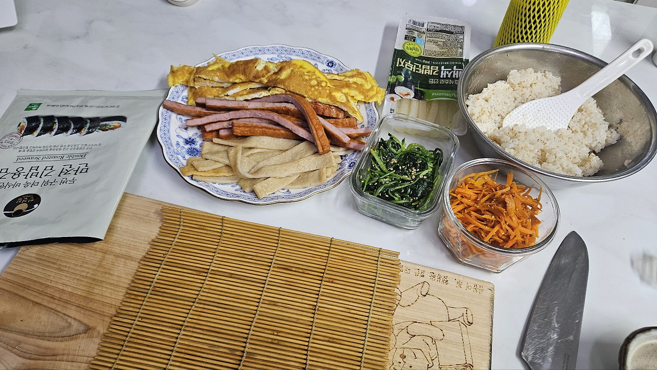 밥을 포함한 모든 재료가 준비되면 제 할 일은 끝납니다. 아내가 작업을 시작합니다. 저는 손재주가 확실히 없는지 이상하게 김밥 말기는 젬병입니다. 예전에 두어 번 시도했다가 대차게 옆구리를 터뜨린 적이 있기에 잘하는 사람에게 맡기기로 합니다.