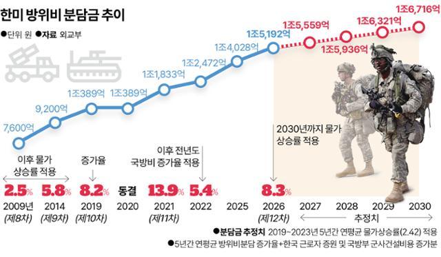 트럼프 대통령이 주한미군에 대한 방위비를 현재 11억 3천만 달러 수준에서 100억 달러까지 올려야 한다는 이야기를 공개적으로 밝힌 바 있습니다. 9배 가까이 올리겠다는 이야기였죠. 2026년 합의한 분담금은 2025년보다 8.3% 인상된 1조 5천192억 원(약 11억 3천만 달러)입니다. 통계를 보면 저희가 그동안 계속 올려주고 있는 상황이었습니다.