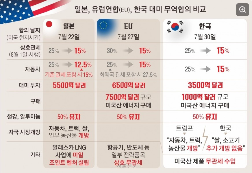 가장 심각한 우려는 외환시장에 미칠 충격입니다. 3,500억 달러는 우리나라 8월 기준 외환보유액 4,163억 달러의 83.3% 수준입니다. 반면 일본이 서명한 투자 규모 5,500억 달러는 외환보유액 1조 3200억 달러의 41.6%에 불과합니다. 일본은 사실상 기축통화국이어서 한국보다 훨씬 쉽게 자금을 조달할 수 있죠.