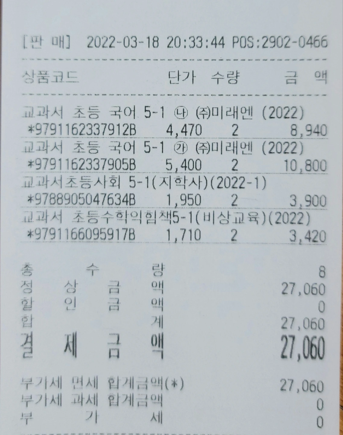하지만 얼마 지나지 않아 제 고민은 쉽게 해결되었습니다. 새로운 미션이 아내로부터 하달되었거든요. 그것은 바로 아이들이 배우는 5학년 1학기 주요 과목의 교과서 구매였습니다.
