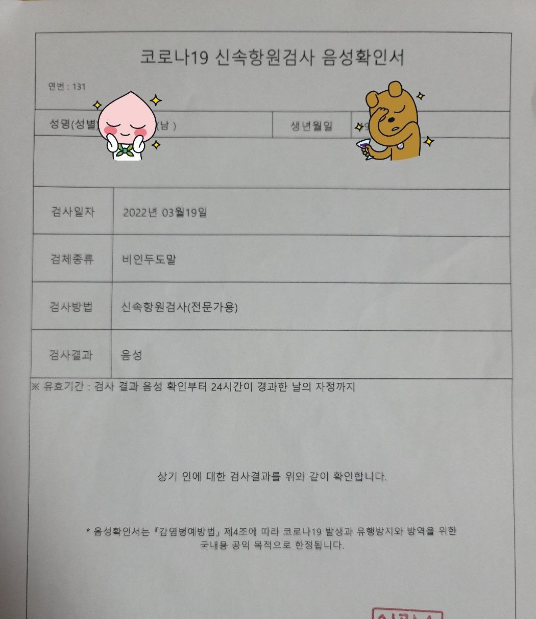 18일 금요일 저녁 병원 신속항원검사 : 음성