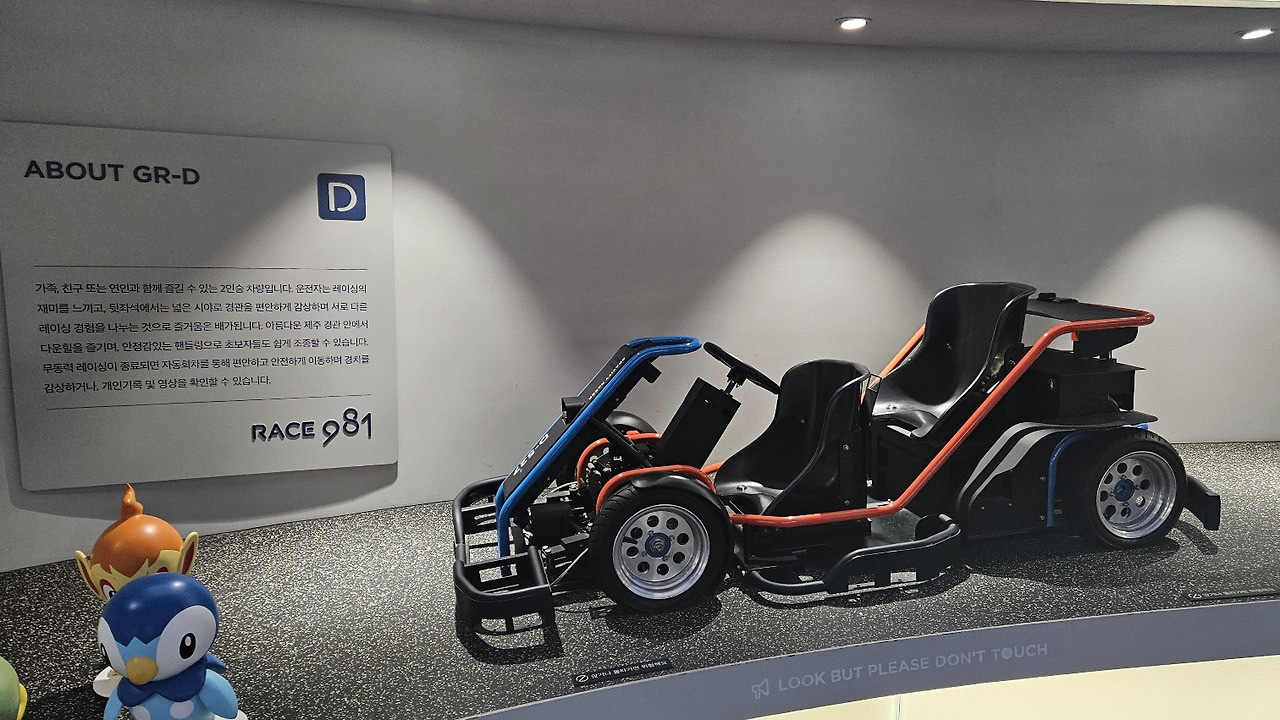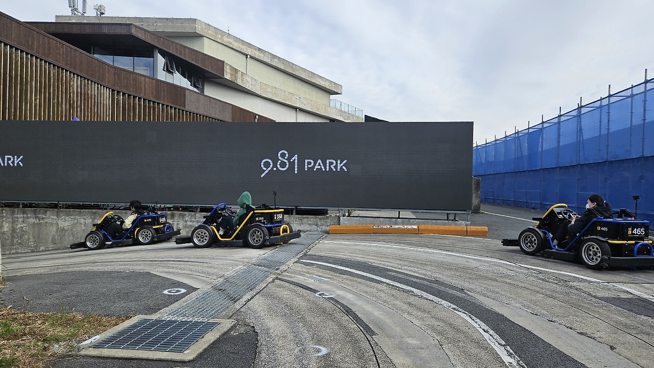 제주 9.81 파크는 제주 애월에 위치한 세계 최초의 무동력 레이싱 테마파크라고 하더군요. 일명 스마트 레이싱 파크라고도 부른다고 합니다. 중력 가속도(9.81m/s²)만을 이용한 친환경 레이싱 '레이스 981'이 주력 액티비티이며, 그 밖에도 다양한 실내 액티비티도 즐길 수 있는 스마트 테마파크로 만들어진 곳입니다.