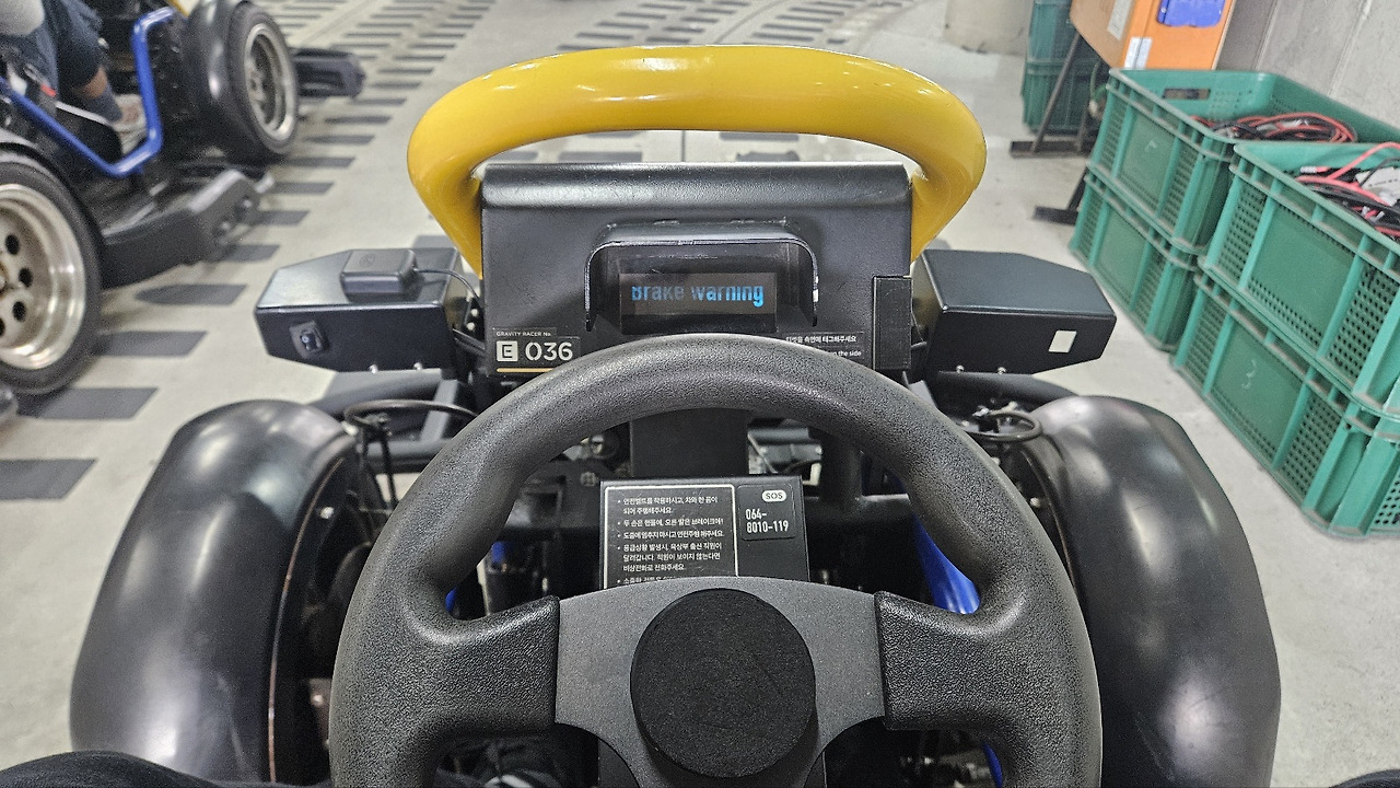 레이싱은 정해진 세 개의 코스를 순서대로 세 대의 카트가 동시에 출발해서 함께 돌면서 기록을 측정하는 방식으로 이뤄집니다. 3번 코스부터 시작해 1, 2번 코스를 돌게 된다고 설명하시더군요. 탑승을 했는데 카트는 그렇게 공간이 넓지는 않았습니다. 엑셀은 없고 브레이크만 오른쪽에 있으며 핸들은 다소 묵직한 편이었습니다.