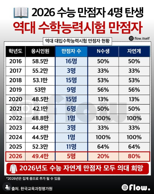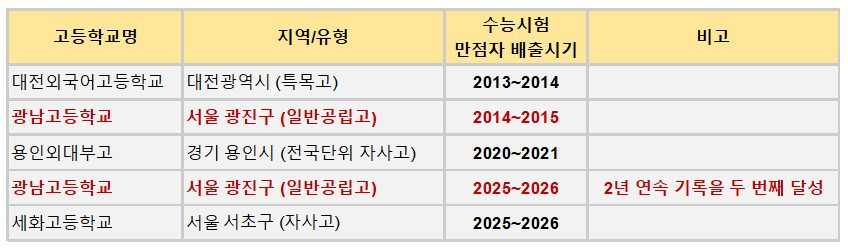 여담이지만 올해 수능 만점자는 5명(재학생 4명, 재수생 1명)이라고 합니다. 재학생 만점자는 서울 광남고·세화고, 광주 서석고, 전주 한일고였고 졸업생 1명은 서울과학고 출신이었습니다.