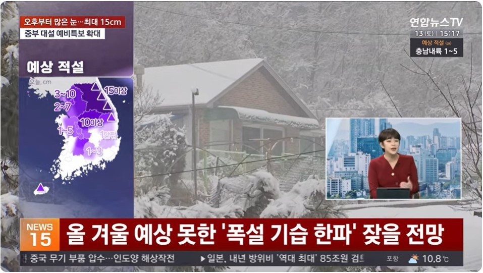 장모님께서 이런 우려를 먼저 전달하셨고 저도 목요일부터 일기예보에 촉각을 곤두세웠습니다. 이 정도의 상황이라면 눈이 오지 않기는 어렵겠다 싶었고 어느 정도 내릴지가 변수가 될 수 있었으니까요. 그렇게 목요일 오후부터 금요일 밤, 출발하려고 했던 토요일 아침까지도 실시간 날씨뉴스를 보고 있었습니다.