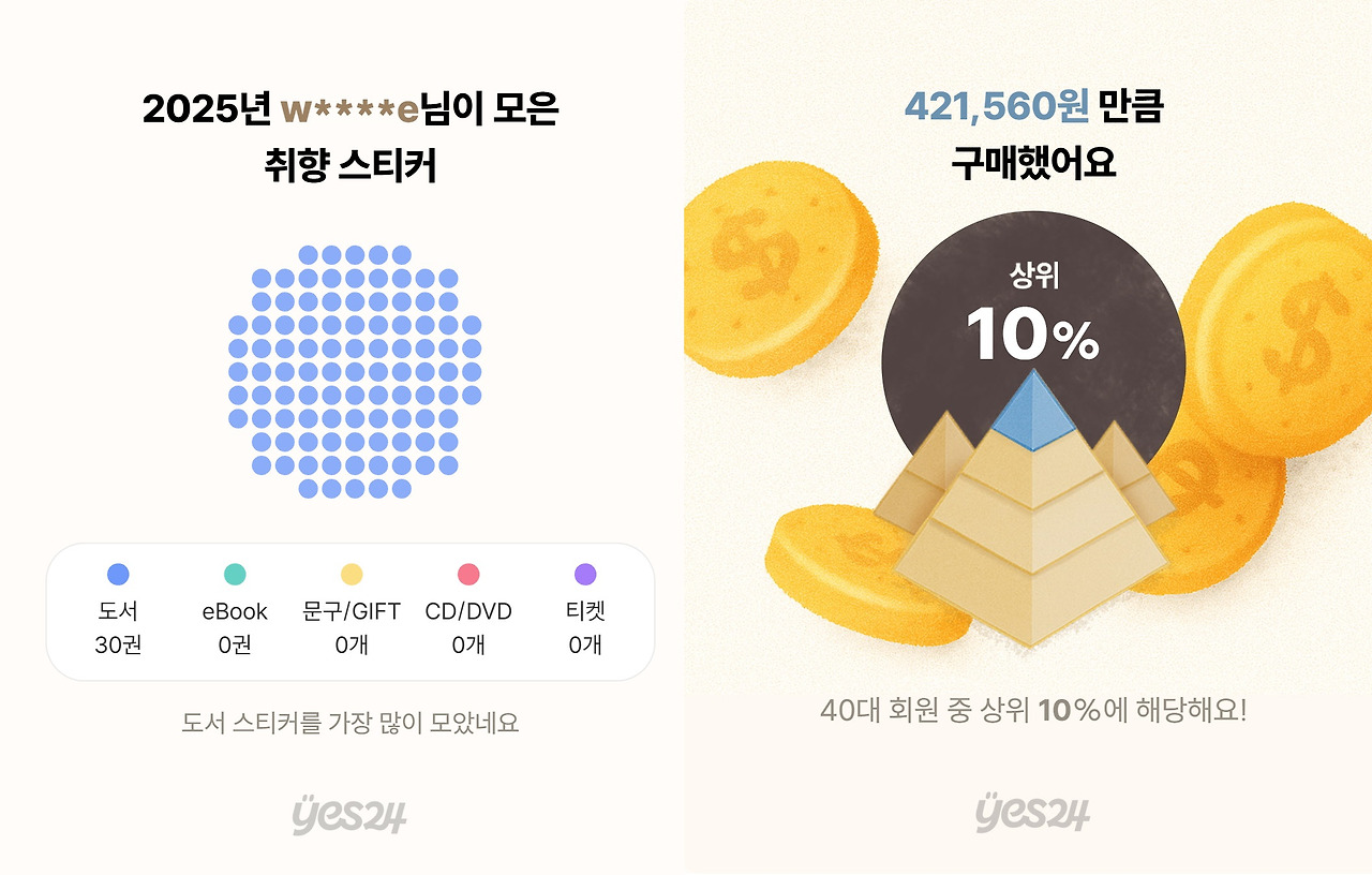 YES24는 판매만 하는 사이트다 보니 특별한 감흥이 일어나는 데이터는 없었습니다. 올해 책을 많이 샀구나 하는 정도죠. 아이들 문제집도 산 적도 많았고 알라딘 중고서점에서도 책을 구했으니 구매력에 대한 순위가 딱히 의미 없어 보이기는 합니다. 그래도 상위 10%라고 하니 기분은 좋더군요.