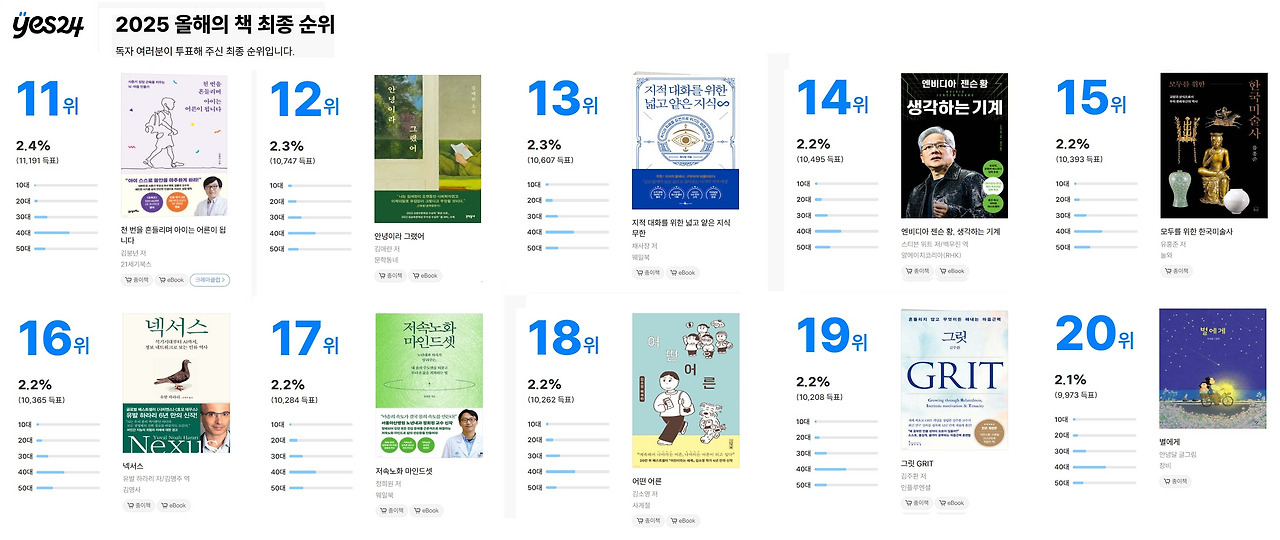 특이한 점은 YES24의 올해의 책과 교보문고의 2025 베스트셀러 20권 중에서 겹치는 책이 단 여섯 권뿐이었다는 점입니다. 플랫폼의 성향 차이일 수도 있고 좋은 책과 잘 팔리는 책에는 차이가 있는지도 모르겠다는 생각도 듭니다.