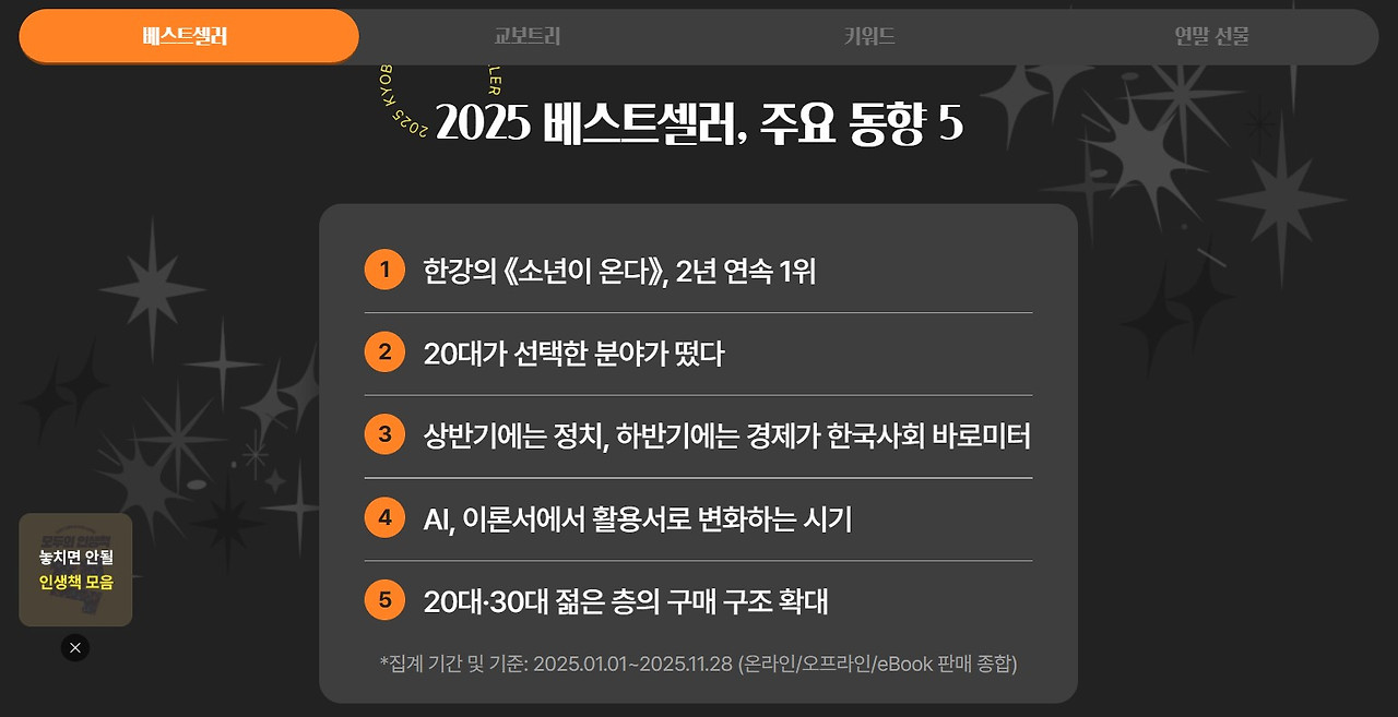 교보문고에도 들어가 봤더니 YES24와는 다른 방식으로 연말 분석을 해놨더군요. 트렌드 분석까지는 좋았는데 베스트셀러 목록을 엑셀로 작성해서 조금 아쉬웠습니다. 보기에 썩 편하지는 않더군요.