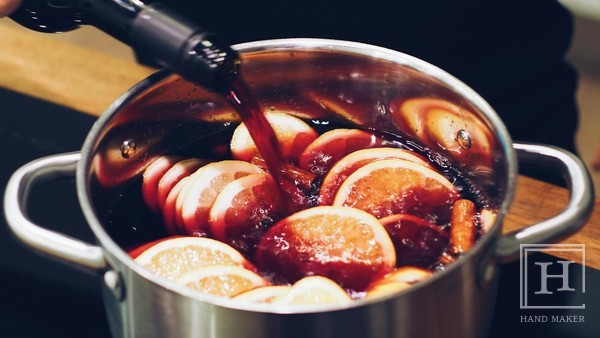 만드는 방법은 의외로 간단합니다. 레드 와인 한 병에 오렌지와 사과를 동그랗게 슬라이스해서 넣고, 시나몬 스틱 두 개, 정향 대여섯 개, 팔각 한두 개를 넣습니다. 여기에 설탕이나 꿀을 세네 큰술 정도 넣고 약한 불에서 천천히 데우면 됩니다. 중요한 건 절대 끓이지 않는 것입니다. 보글보글 끓으면 알코올이 다 날아가고 쓴맛만 남거든요. 70도에서 80도 정도로 은근히 20분에서 30분 데우면서 향을 우려내면 완성입니다.