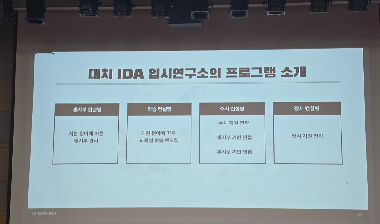 IDA입시연구소에 대해 정확히 설명드리면 대치동에 본원을 둔 대학 입시 컨설팅 전문 기관입니다. 수험생들을 대상으로 수시, 정시, 생활기록부 관리, 면접 등 대입과 관련된 전 과정에 대해 전략을 세워주고 가이드라인을 제공하는 곳입니다.