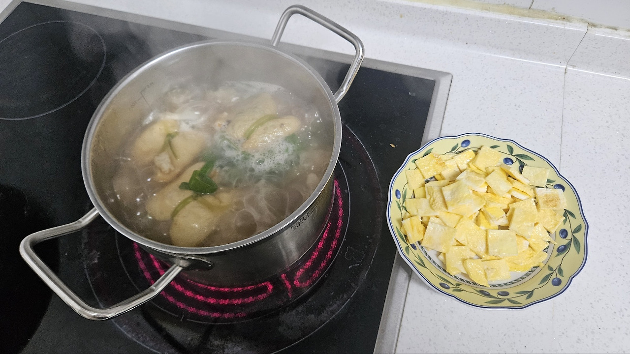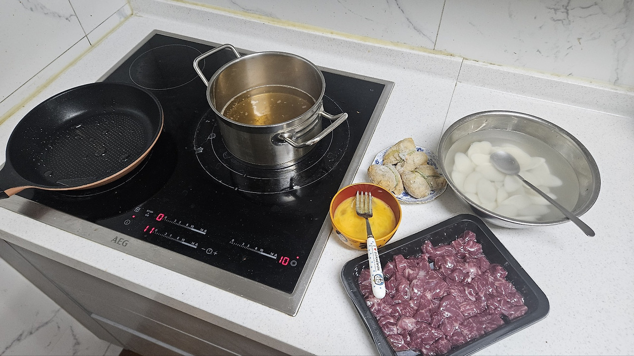계란 푼 물로 계란국처럼 만들 때도 있지만 보통은 이렇게 계란지단을 만들어줍니다. 이 또한 고객의 요청사항입니다. 이렇게 만든 떡국은 꽤 인기가 많은 편이었습니다. 그런데 언젠가부터 호불호가 명확해진 아이들이 너무 자주 한다는 민원을 제기하더군요. 다행스러운 일인지는 모르겠으나 맛이 없다는 말을 하지는 않습니다.