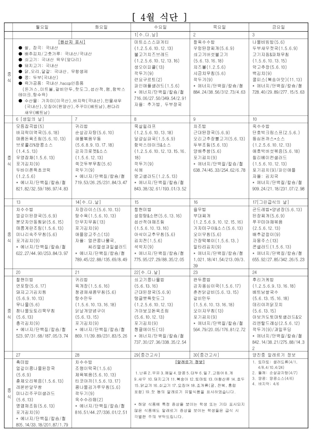 저희 집은 매달 학교의 식단표를 뽑아서 식탁 근처에 붙여둡니다. 집에서 준비하는 메뉴가 학교와 겹치는 일을 최소한으로 줄이기 위해서죠. 그렇게 하고 있어도 잘 먹게 만드는 데 부족하다고 느낄 때가 많네요. 한창때 잘 먹이고 싶은데 말이죠.