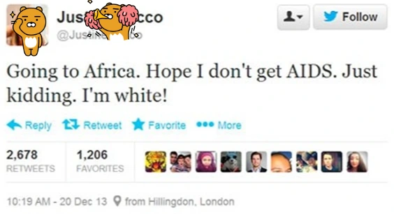 특히 미국에서는 인종차별 발언들이 큰 문제가 되는 경우가 많았습니다. 2013년 어떤 회사의 임원은 SNS에 인종차별을 한 게시물을 올렸습니다. 팔로워가 170명 정도뿐이었지만 그중에는 기자가 있었고 이 글은 널리 알려지게 되었습니다. 출장을 위해 비행기에 탈 때 글을 올렸던 그 사람은 목적지에 착륙한 당일 해고가 되기도 했죠.