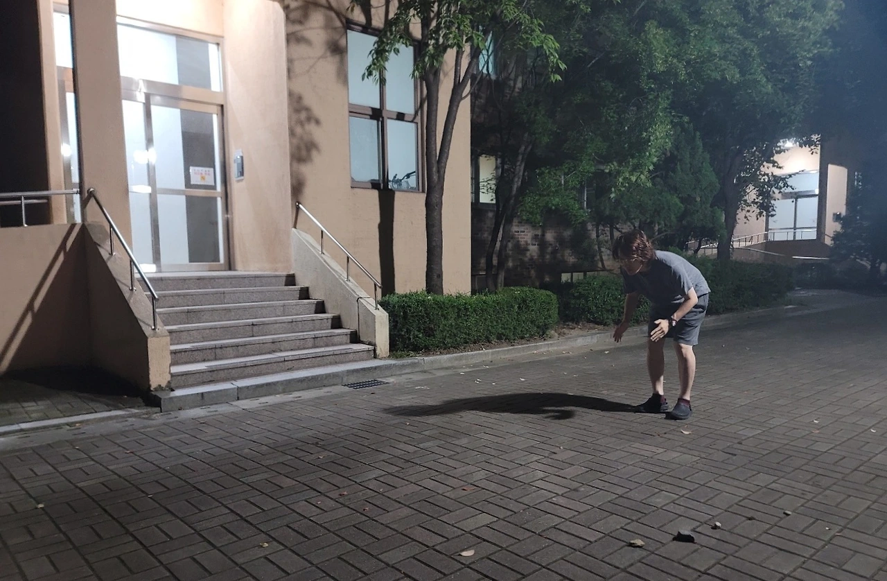 집 앞으로 일단 나갔습니다. 바닥에 깔려있는 보도블록의 길이가 딱 20cm여서 따로 줄자로 측정할 필요가 없어서 편하긴 했습니다. 다만 한편으로는 바닥이 많이 딱딱하다 보니 연습을 하면서 다치거나 무릎이나 발목에 무리가 가지 않을까 걱정이 되기도 했죠.