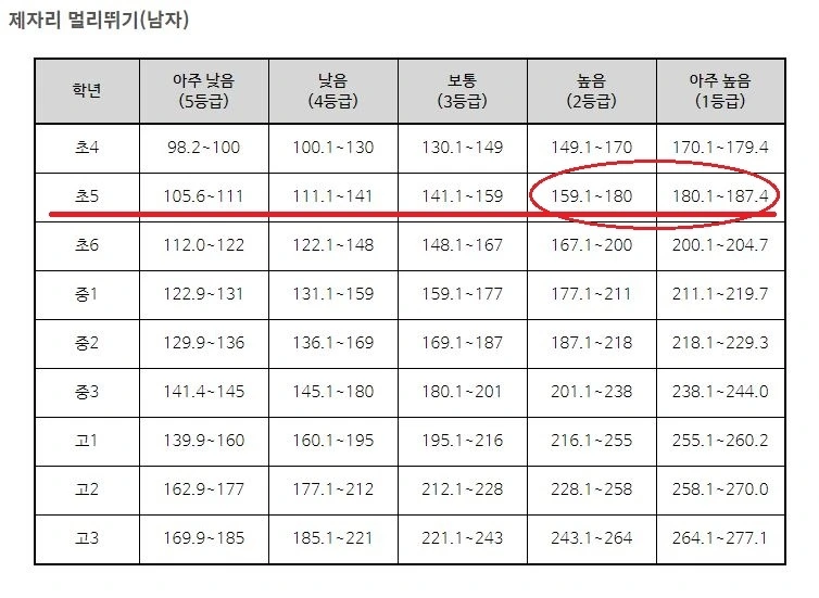 제자리멀리뛰기의 등급표를 보니 생각보다 기준이 높다는 것이 느껴집니다. 아이의 키보다 더 큰 160cm를 기록해도 겨우 2등급이라니..
