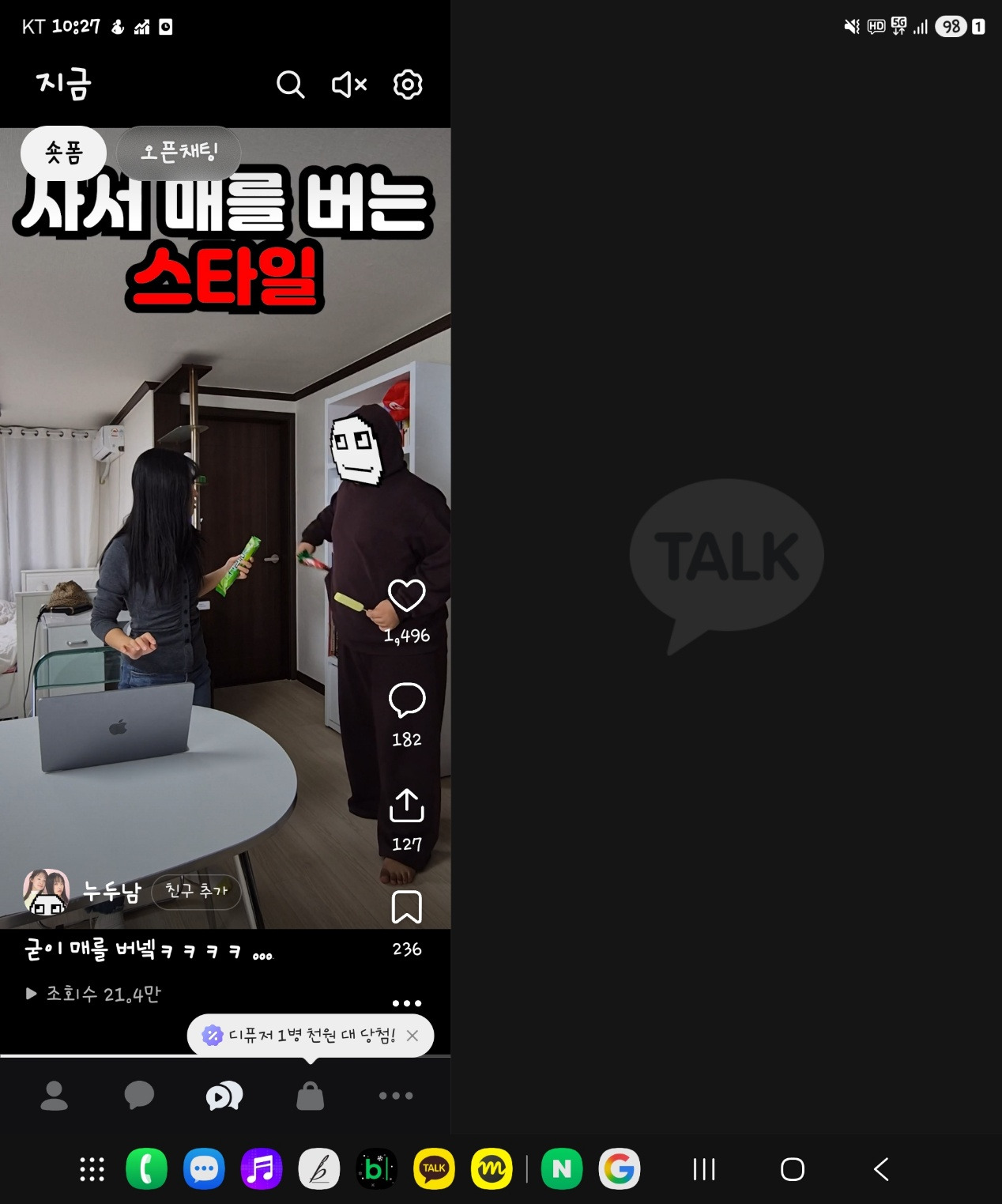 최근 몇 달간 온 나라를 떠들썩하게 했던 카카오톡까지 업데이트 이후 서비스를 슬쩍 끼워 넣었습니다. 저는 요즘 카톡의 숏폼 콘텐츠 때문에 아주 미칠 지경입니다. 앱을 열고 오픈채팅 탭을 열 때마다 자동으로 나타나 재생이 되는 바람에 스트레스가 이만저만이 아니어서죠.