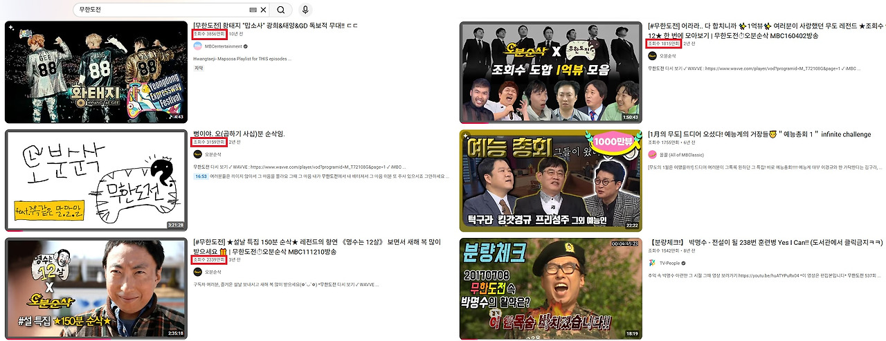 얼마 전부터 가끔 시간이 나면 유튜브에서 무한도전을 봅니다. 생각 없이 웃고 싶을 때 틀기 가장 좋은 예능이기 때문입니다. 그런데 저처럼 생각하는 사람이 정말 많은가 보더라고요. 2005년 4월 23일 첫 방영을 시작해 2018년 3월 31일 종영한 지 벌써 8년이 다 되어가는데도 조회수가 높게 나오고 있어서죠.
