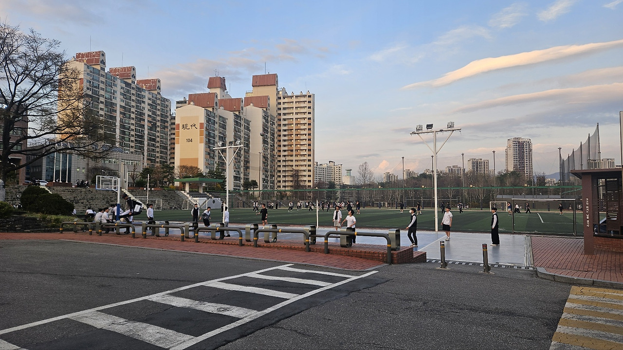 내년에 고등학생이 되는 둥이들의 선택지에 들어가 있는 학교 중 하나이기에 조금 일찍 도착해 주변 환경을 살펴보기로 했습니다. 20분 정도 먼저 학교로 들어오니 6시가 넘은 시간이었음에도 아직 남아있는 학생들이 많더군요. 운동장에서 열심히 운동하는 아이들을 보니 안쓰럽기도 하고 기특하기도 합니다.