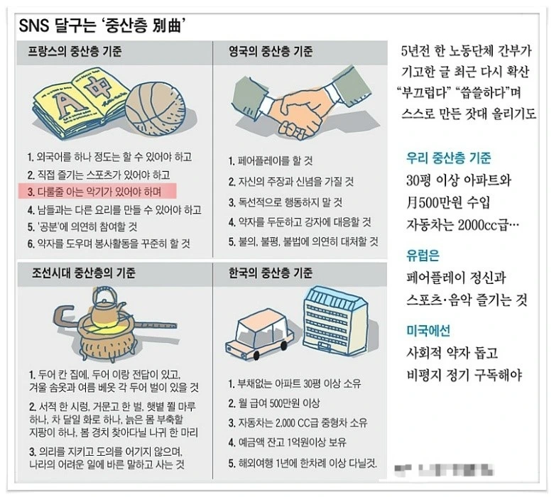 예전에 각 나라별 중산층의 기준이 화제가 됐었습니다. 다른 나라와는 달리 물질만능주의에 사로잡힌 한국의 실태를 적나라하게 꼬집는 아픈 내용이었죠.