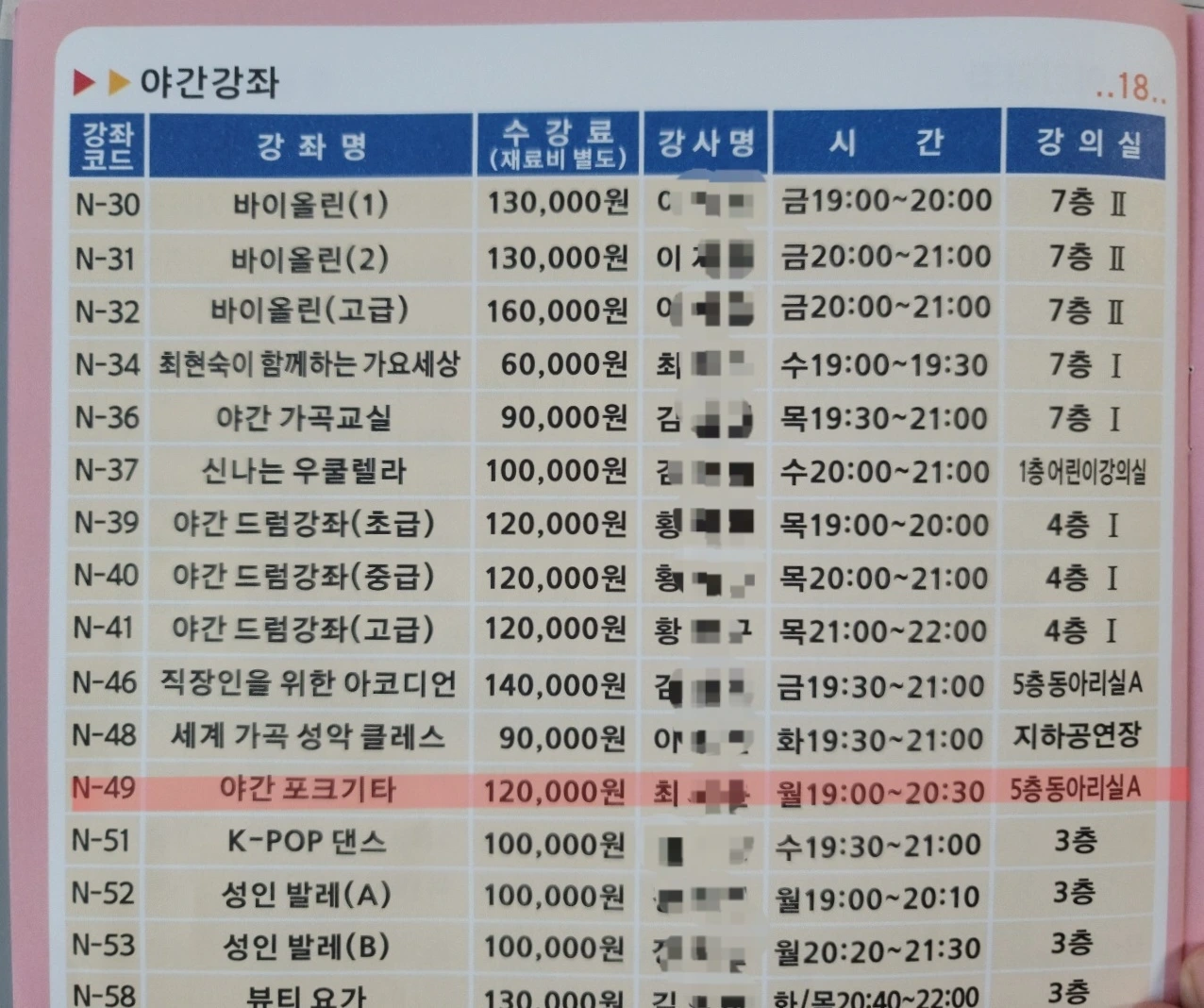 새로운 것을 배우는 것을 꺼려하지는 않았기에 신나게 아이쇼핑을 하기 위해 팸플릿을 넘겨봅니다. 고민을 하다가 아이와 함께 드럼을 배우면 좋겠다 싶어서 설득을 해봤는데 아이는 크게 흥미가 없다네요.