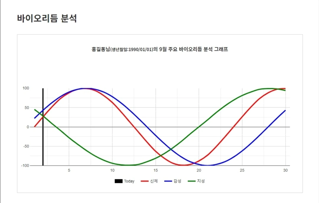 인체에 신체, 감성, 지성 세 가지의 주기가 있고 이 주기는 생년월일에 따라 다양한 패턴으로 나타납니다. 이 패턴의 조합으로 인간의 활동에도 유의미한 차이가 발생한다는 주장으로 한때 꽤 유행했습니다. 얼마 지나지 않아 과학적인 이론으로 받아들이지 않고 있고 저 멀리 사라져 버렸죠.