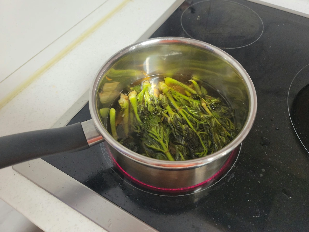 그러고서는 다음 말을 기다리지도 않고 빛의 속도로 소스의 바다에서 목욕재계 중인 두릅 친구들을 밖으로 강제 퇴거시킵니다. 급히 물을 끓인 뒤에 사우나를 시켜주고 나니 두릅들에게서 한결 부드러운 느낌이 납니다.