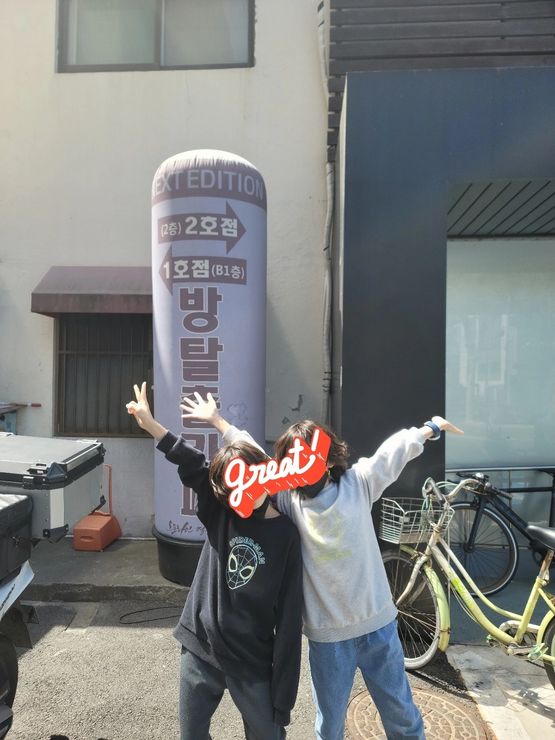 건대 부근에 있는 방탈출 카페에 드디어 도착했습니다. 기념비적인 날이기 때문에 평소에 사진 찍는 것을 좋아하지 않는 아이들은 제 포즈 요구에 한 마디의 불평 없이 호응을 해줍니다. 진작 데리고 올 걸 그랬나 싶습니다.