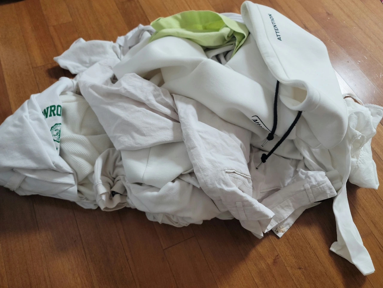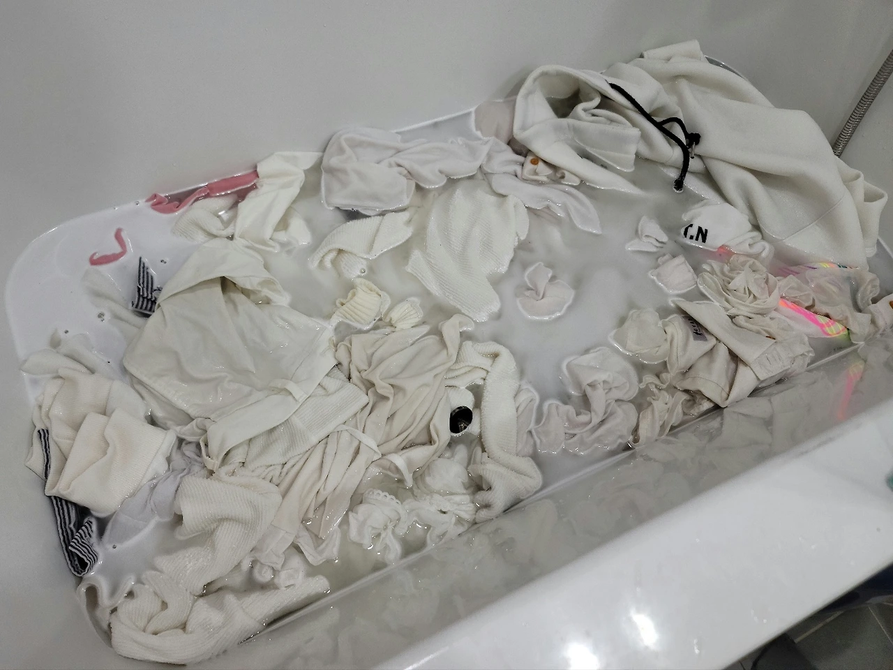 하지만 일은 여기서 끝나지 않습니다. 그다음 정리할 대상은 하얀 옷들입니다. 예전에 세탁소를 운영하시는 유튜버의 채널에서 하얀 옷을 집에서 제대로 표백하는 방법에 대해서 배운 적이 있습니다.