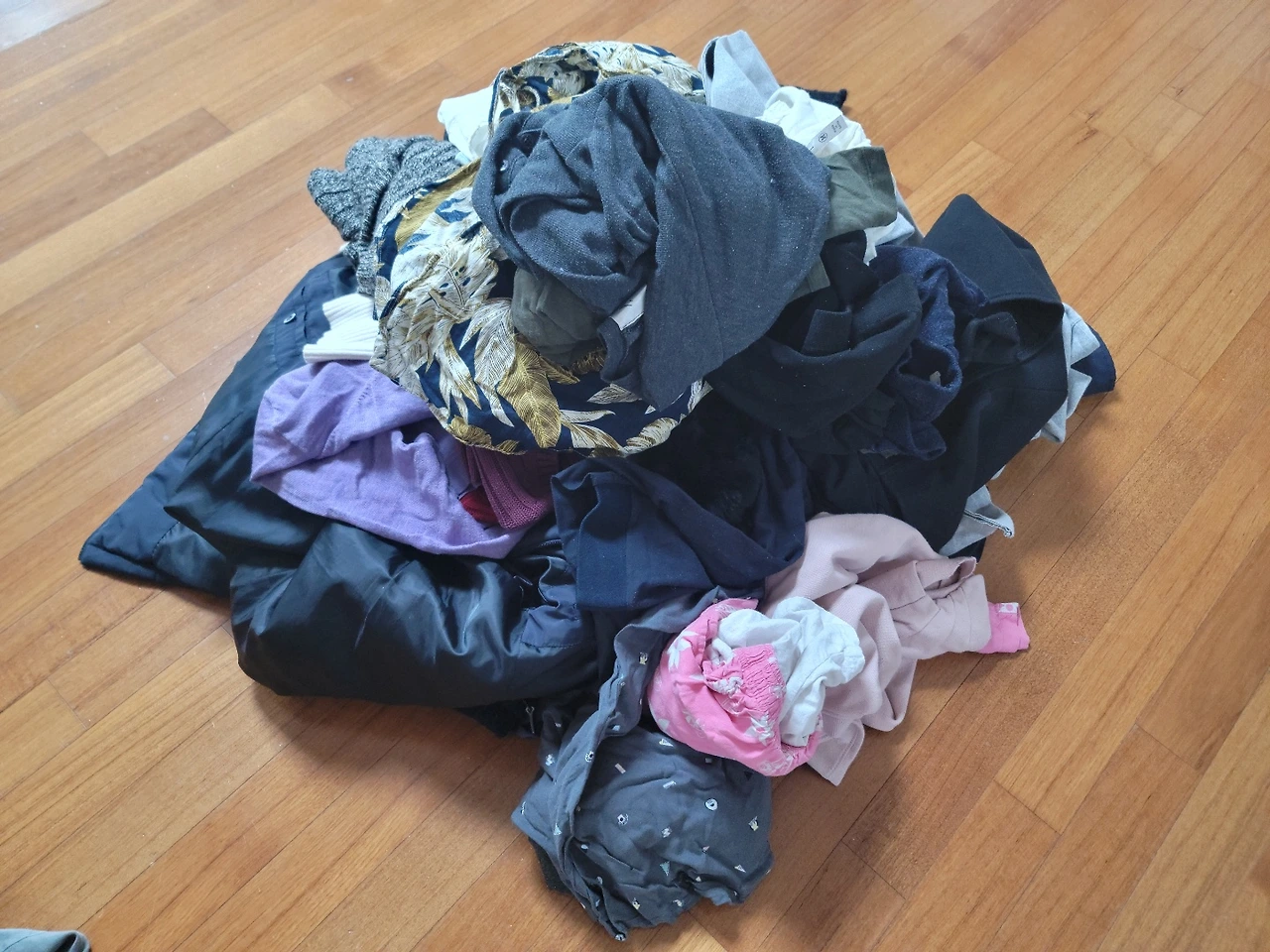 한 시간이 넘는 시간 동안의 정리에서 얻은 제일 큰 소득은 안 입는 옷들을 한 무더기나 버렸다는 사실입니다. 언젠가는 입겠지 입겠지 하면서 안 입은 옷들을 골라내니까 양이 상당합니다. 혹시나 하는 마음에 옷을 한 번 더 입어보며 고민해보지만 딱히 잘 어울리는 것 같지도 않아 버리기로 합니다.
