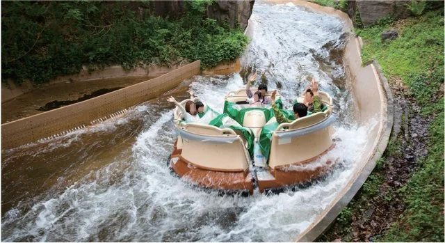 그러면서 둘이서 사이좋게 동그란 배를 타고 밀림의 물길을 가로지르며 물벼락을 맞는 콘셉트인 '아마존 익스프레스'라는 놀이기구도 겨우 하나 탔습니다.