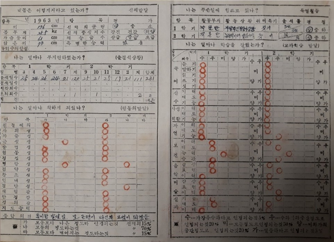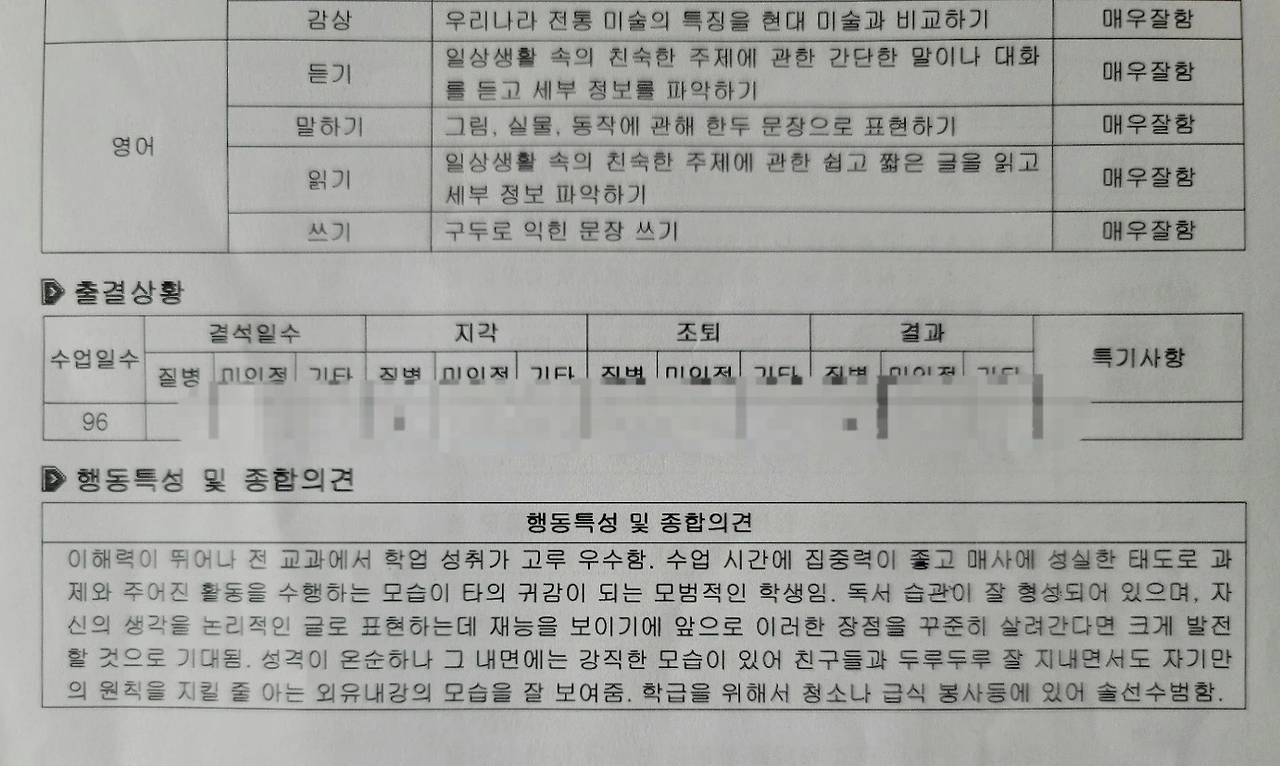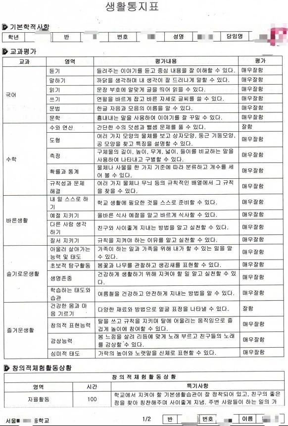 물론 예전에도 30년 전의 저도 통지표라는 이름으로 한 학기의 학교생활을 총망라한 한 장의 종이를 받은 적이 있었습니다. 그렇지만 예전의 통지표와 현재의 통지표가 다른 점은좀 더 세분화가 되어있다는 점입니다.
